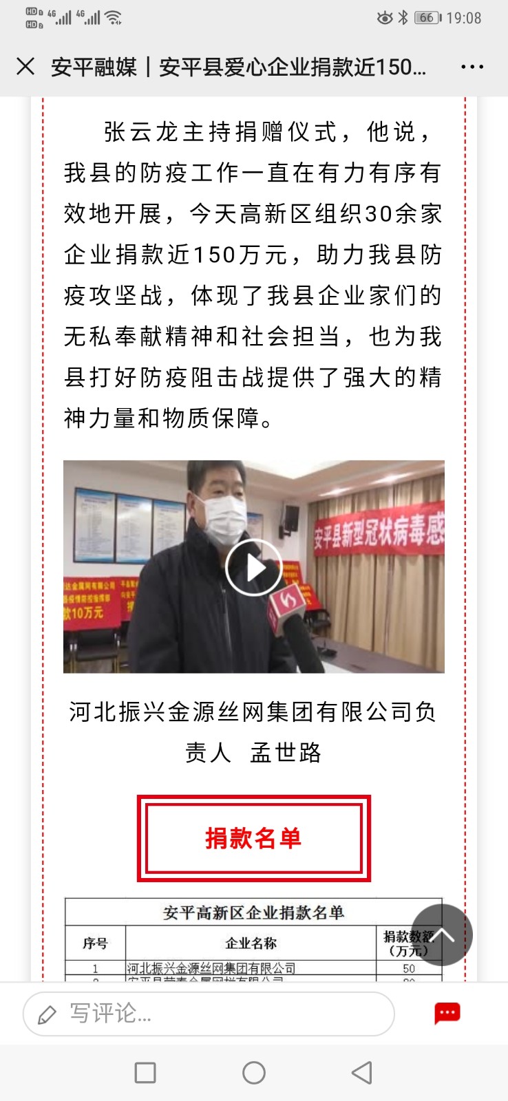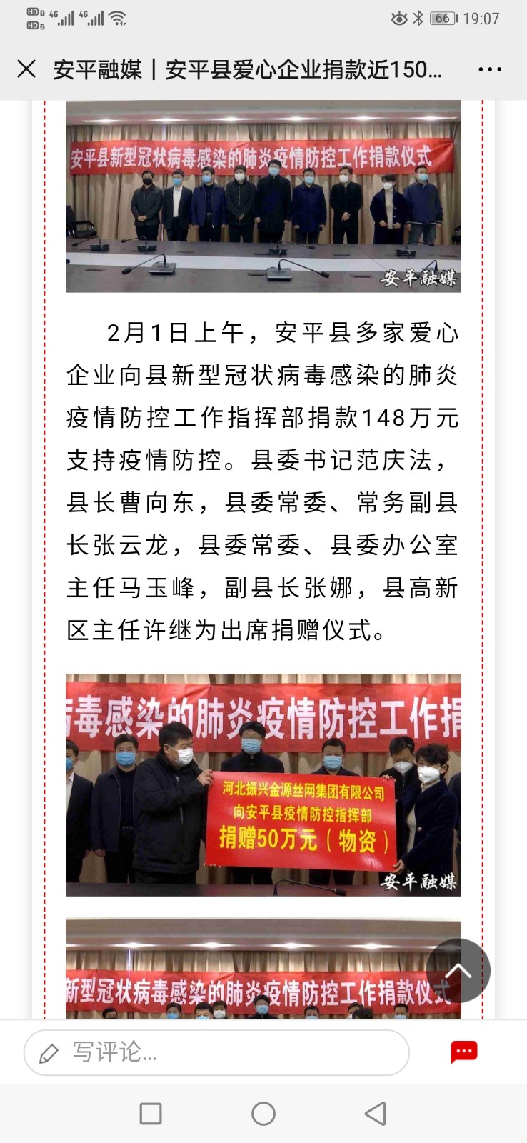 河北振興金源絲網集團為防疫工作貢獻自己的力量。